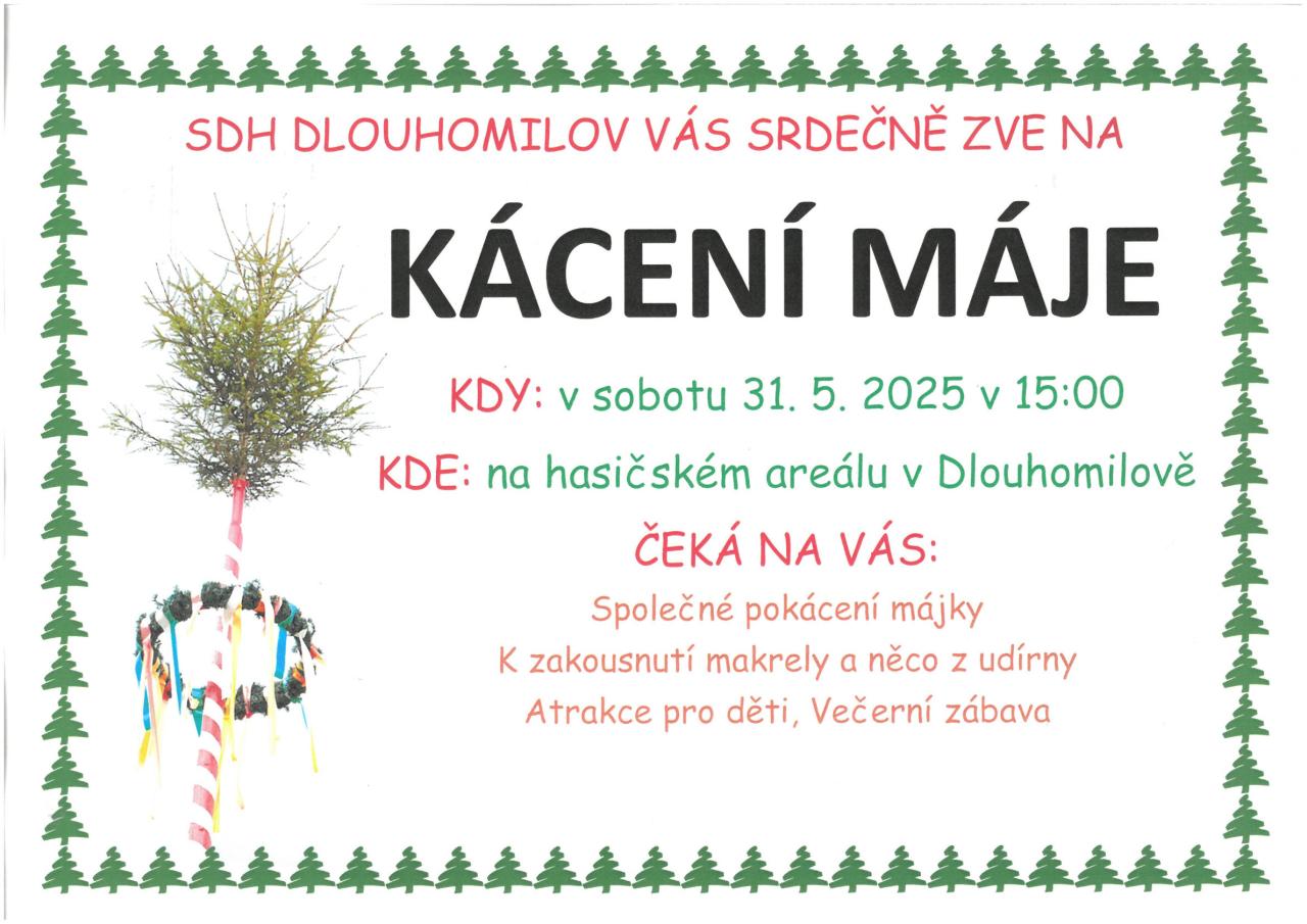 SDH Dlouhomilov Vás srdečně zvou na tradiční ,, Kácení máje ,,. Můžete těšit na makrely a dobroty z udírny, atrakce pro děti a večerní zábavu.