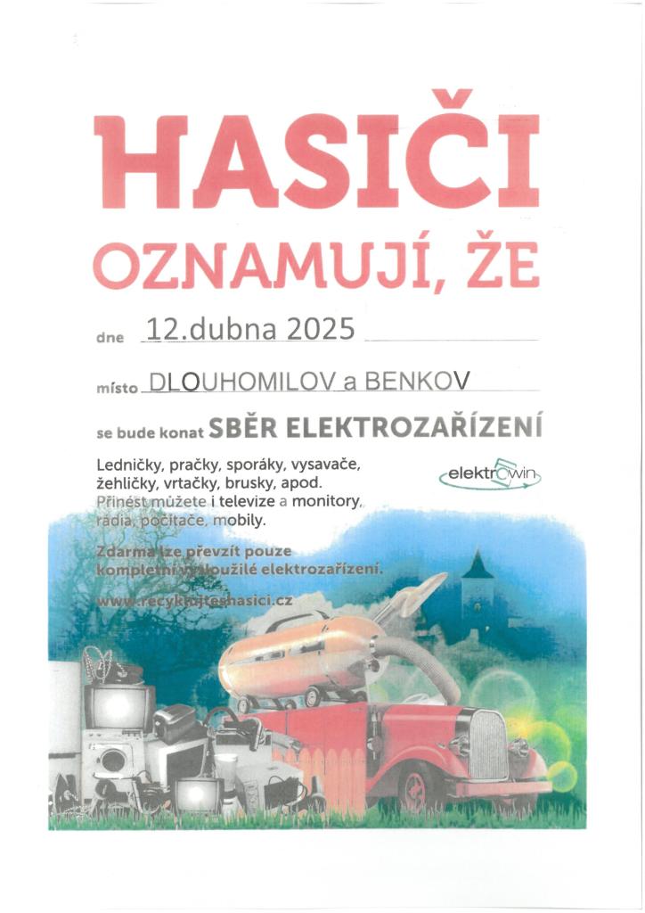 Hasiči Dlouhomilov budou 12.4.2025 provádět sběr vysloužilých elektrospotřebičů.