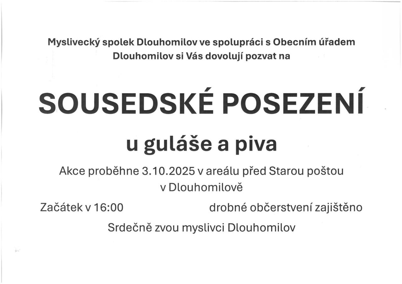 Myslivecký spolek Dlouhomilov Vás zve 3. října od 16:00 hodin na sousedské posezení u guláše a piva v areálu před Starou poštou.