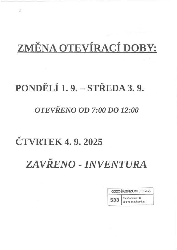 Změna otevírací doby prodejny potravin Dlouhomilov